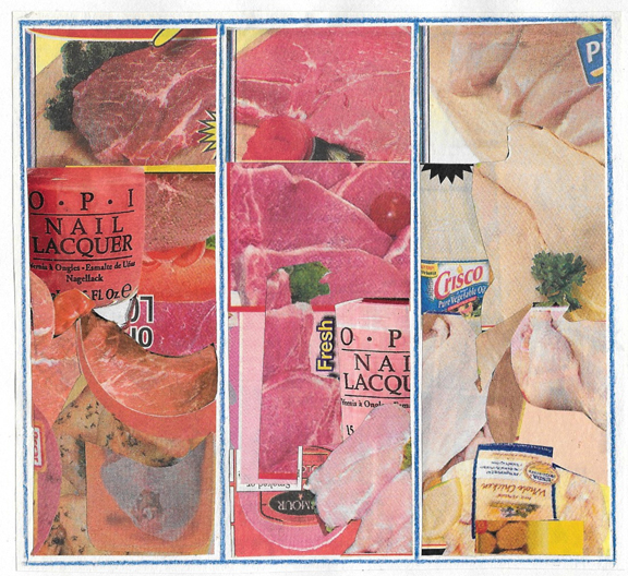 My newest series of digital collages deals with imagery from grocery stores and food delivery trucks. Posters of weekly deals and newsprint advertisements evoke memories of rich flavor and saturated color. Imagery from lettuce and meat distributers promise a “utopian experience” within their product. The glossy exterior presents itself as a trusting, consistent product, though the line between what we’re buying and what we’re promised is often blurred. The source of our food is concealed behind a finished product. Like the brands I reference, I prefer my collages to be pleasing and attractive but to belie a more questionable content.